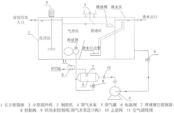 工作過程:集水池的含油污水 通過泵送入氣浮裝置,先進(jìn)入混合反應(yīng)區(qū),在此區(qū)按先后順序分開投加絮凝劑聚合氯化鋁、聚丙烯酰胺,然后進(jìn)入氣浮區(qū)。壓力溶氣罐實(shí)施液位聯(lián)鎖控制,在設(shè)定的高液位下,空壓機(jī)開啟,溶氣泵輸送高壓水氣,通過釋放器,使溶入水中的氣體以微氣泡的形式釋放出來,并迅速而均勻地與水中雜質(zhì)相粘附。在設(shè)定的低液位下,空壓機(jī)自動(dòng)停止,溶氣罐進(jìn)水直到設(shè)定的高液位,如此周期性運(yùn)行。氣浮池上安裝刮渣機(jī),將微氣泡粘附的顆粒從氣浮池浮面刮至排泥管道。全部過程實(shí)現(xiàn)了自動(dòng)控制。