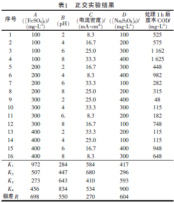 實驗采用正交實驗法來對電解輔助Fe2+活化Na2S2O8工藝處理屠宰廢水的反應條件進行研究,反應時間為60 min,確定FeSO4初始濃度、Na2S2O8初始濃度、電流密度和初始pH 對廢水COD 的影響,采取4 個水平,正交實驗結果見表1。