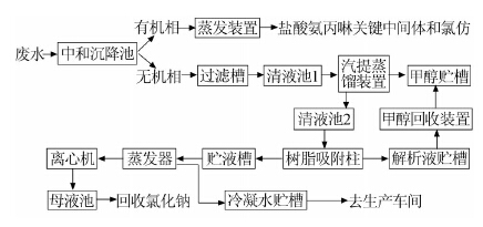 筆者針對該廢水的特性,將多種治理方案進行系統對比,最終確定采用酸堿中和+低溫沉降+樹脂吸附+蒸發濃縮+冷凝水回用的工藝路線。經工程驗證,該方法能有效治理鹽酸氨丙啉堿性高濃度有機廢水,并可回收其中有經濟價值的副產物和鹽,治理后廢水可直接作為工藝用水回用,處理成本僅為256元/m3,為常規處理方法的20%,具有很好的經濟和社會效益。