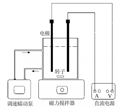 實驗裝置見圖 1 。反應容器由樹脂玻璃制成(內徑14 cm,高16 cm,厚2.5 mm),容積為2.5 L。兩電極 為鐵電極(長25 cm,直徑5 mm,純度98.5%),垂直插入溶液中,電極相距8 cm,距容器底部1 cm,浸 沒在水溶液中的電極表面積為18.84 cm2,兩電極與直流電源相連。容器與蠕動泵相連接, 保證水循環。實驗在25 ℃下進行,每次實驗將2 L銅冶煉廢水過濾后,用1 mol/L NaOH 調節其pH,然后加入到容器 中,加3 g NaCl以提高電導率。接通電源,反應開始。反應完成后取10 mL溶液過0.45 μm微濾膜,用 原子熒光分光光度計測定濾液中的砷;用原子吸收分光光度計測定濾液中的銅、鎘、鉛、鋅。
