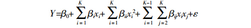 式中: xi、xj為自變量; β0為常數項; βi、 βii、βij 分別為一次項、二次項、交互項的回歸系數;K為影響因素個數; ε為誤差項,包括實驗誤差和擬合不足誤差。