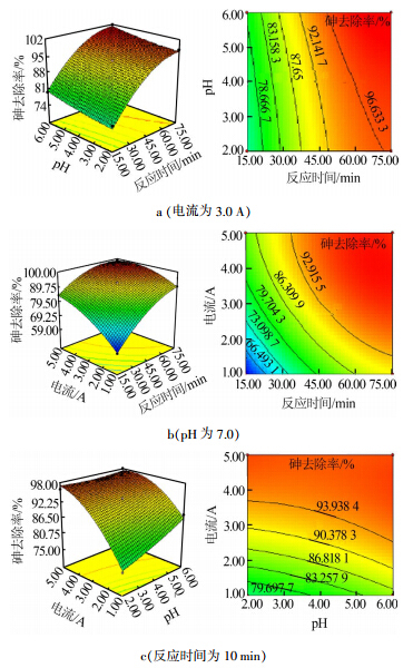 不同因素對砷去除率影響的三維曲面圖和等高線圖如圖 2 所示。