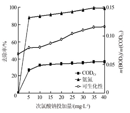 由圖 1可以看出,在次氯酸鈉投加的初始階段,隨著次氯酸鈉投加量的增加,CODCr、氨氮 去除率迅速增大,當次氯酸鈉投加量為5 mg/L時,CODCr、氨氮去除率分別達到26.5%和 88.1%,繼續增加次氯酸鈉投加量,CODCr、氨氮去除率上升的幅度變小。廢水可生化性隨 次氯酸鈉投加量的增加呈逐漸提高的趨勢,當次氯酸鈉投加量為35 mg/L時,m(BOD5)/ m(CODCr)達到0.115,之后提高不大。次氯酸鈉預處理對焦化廢水可生化性的改善不大。 以去除CODCr和氨氮考慮,次氯酸鈉投加量為5~10 mg/L即可。