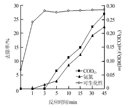 (2)采用臭氧氧化預處理焦化廢水,CODCr和氨氮去除率均較低,反應時間為45 min時, CODCr和氨氮去除率僅分別達到26.9%和22.3%;但其對廢水可生化性提高迅速,反應3 min ,m(BOD5)/m(CODCr)即由原水的0.068提高到0.281。