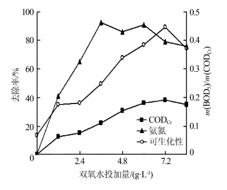 由圖 3可知,隨雙氧水投加量的加大,CODCr、氨氮去除率及廢水可生化性均呈先上升后下 降的趨勢。當雙氧水投加量為3.6 g/L時,氨氮去除率達到最大,為92.4%;當雙氧水投加量為7.2 g/L 時,CODCr去除率、m(BOD5)/m(CODCr)達到最大,分別為38% 、0.445。綜合考慮,雙氧水最佳投加量為7.2 g/L。