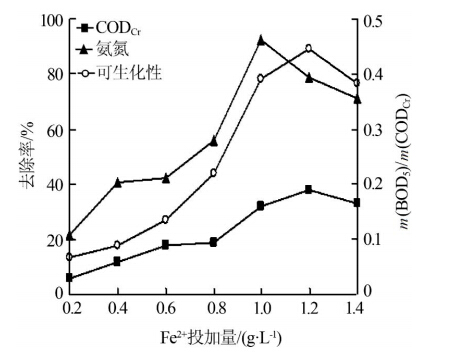 由圖 4可知,隨著Fe2+投加量的增加,CODCr、氨氮去除率及廢水可生化性均呈 先上升后下降的趨勢。當Fe2+投加量為1.0 g/L時,氨氮去除率達到最大,為92.4%;當 Fe2+投加量為1.2 g/L時,CODCr去除率、m(BOD5)/m (CODCr)達到最大,分別為38%、0.445。在生成·OH的過程中,Fe2+會消耗 部分H2O2,過量的Fe2+,會使反應初始瞬間產生過多的·OH,其 發生自身反應而被消耗掉,導致氧化性下降。