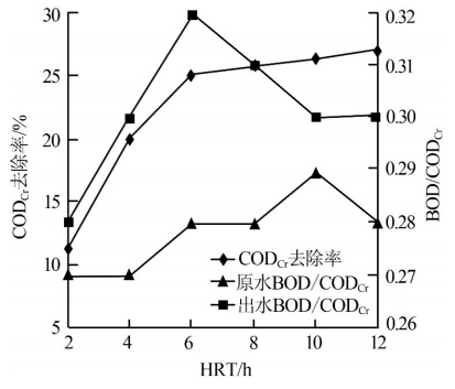 HRT對CODCr去除率及廢水可生化性的影響如圖 1 所示。