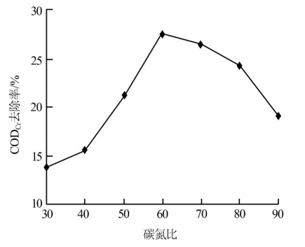 由圖 2 可知,隨著碳氮比的增加,CODCr去除率呈先升高后下降的趨勢。氮源不足,即碳氮 比過高,不利于水解酸化細菌增殖,而且消化液的緩沖能力下降,微生物對難降解有機物的分解能力降 低,導(dǎo)致CODCr去除率不高。相反,若氮源過剩,即碳氮比過低,一方面氮不能被微生物充 分利用,另一方面容易導(dǎo)致對微生物有毒害作用的NH3含量的上升,使處理效率降低 。本試驗最佳碳氮比為60∶1。