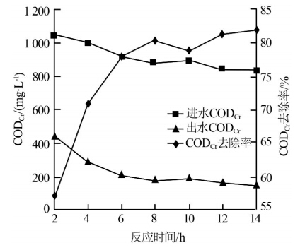 由圖 3 可知,隨著反應(yīng)時間的延長,CODCr去除率增大,當(dāng)反應(yīng)時間從2 h增加至8 h 時 ,CODCr去除率由57%增加至80%,但當(dāng)HRT從8 h增至14 h時,CODCr去除率僅增 加到82%。