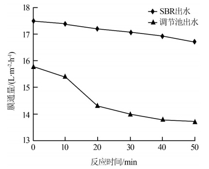 由圖 4 可以看出,對調(diào)節(jié)池出水,50 min內(nèi)膜通量降低13.29%,而對SBR出水,50 mim內(nèi)膜通量降低 4.57%,說明未經(jīng)生化反應(yīng)的中段廢水對膜的污染較嚴(yán)重。雖然將微濾膜置于生化處理前作為預(yù)處理單 元可以截留大量高分子有機物及SS,但增大了膜的清洗難度和頻率,由于膜污染較重,水力清洗后還需 另加化學(xué)藥劑清洗,而SBR出水對膜通量的影響較小,清洗也更方便。因此,選擇微濾工藝作為生化反 應(yīng)的后續(xù)工藝,即微濾膜置于SBR后是合理的。