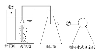 好氧池的污泥取自常州武進某污水 處理廠的二沉池回流污泥,在曝氣量1 L/min的條件下悶爆10~15 d左右,進水量由小到大逐漸增加。由于活性污泥及生活污水均取自該廠,因此活性污泥的適應性較強,很快就達到所需濃度,控制MLSS為2000~ 5000mg/L。過濾壓力由循環水式真空泵(壓力可調)提供,壓力控制在0.02 MPa,水溫保持在18~25 ℃。膜組件為U型中空纖維模型,有效過濾面積均為0.02 m2,浸沒在15L好氧池。