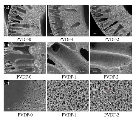 在不同放大倍數下用SEM研究PVDF中空纖維膜斷面結構,如圖 3所示。