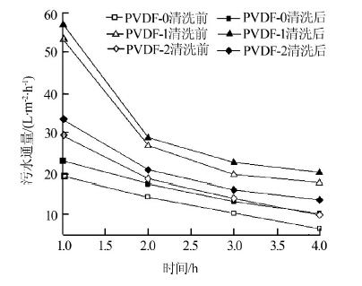 由圖 4可見,清洗后純水通量基本能恢復,PVDF-0、PVDF-1、PVDF-2的恢復率分別為87.5%、95.6%、91.9%。