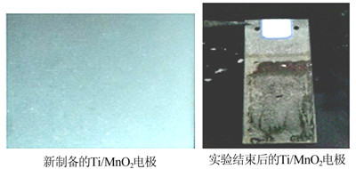 先對Ti基體進(jìn)行預(yù)處理,再用電沉積法制備 Ti/MnO2電極。新制備的電極在電解過程中表面層容易脫落,電極壽命很短,用該電極降解處理苯酚廢水,去除率只能達(dá)到50%左右,Ti/MnO2電極電化學(xué)降解前后的表面如圖 1所示。