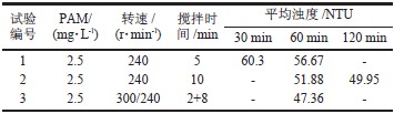 分別取150 g廢水于編號(hào)為1、2、3 號(hào)燒杯中,均放在數(shù)字磁力攪拌器下。1 號(hào)燒杯加入2.5 mg/L的PAM 后開始計(jì)時(shí),以240 r/min 攪拌5 min,測(cè)定靜置30 min 和60 min 后上層清液濁度;2 號(hào)燒杯加入2.5 mg/L 的PAM 后開始計(jì)時(shí),以240 r/min 攪拌10 min,測(cè)定靜置60 min 和120 min 后上層清液濁度;3 號(hào)燒杯加入2.5 mg/L 的PAM 后開始計(jì)時(shí),先以300 r/min 攪拌2 min,再以240 r/min 攪拌8 min,測(cè)定靜置60 min 和120 min 后上層清液濁度。