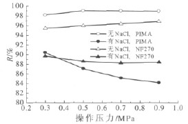 圖1 操作壓力對PMIA 納濾膜染料截留率的影響
