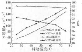 Fig.5 Effect of feed temperature on the performance of NF membrane