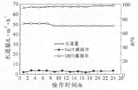 在25℃、0.7M Pa 下考察了所制PMIA 芳香聚酰胺納濾膜在24 h 連續運行下的穩定性,染料濃度為100 mg·L-1,NaCl 濃度為170 mmol·L-1,試驗結果如圖6 所示。