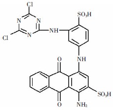 試驗所用染料為人工配制的酸性大紅和活性藍X-BR,此2 種染料常用于羊毛、蠶絲、棉綸及其混紡織物的染色。分子式見圖1、圖2。