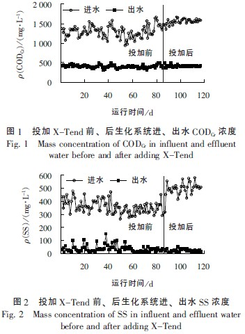 圖1、圖2 為投加X-Tend 前、后曝氣池進、出水CODCr、SS 濃度的變化情況。