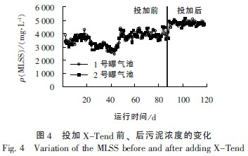 此外,營養增效劑X-Tend 的使用還提高了系統內的污泥濃度(圖4)。投加X-Tend 前,MLSS的質量濃度變化范圍為2 477 ~ 4 534 mg/L,平均值為3 580 mg/L;投加后,MLSS 的質量濃度變化范圍為4 410 ~ 5 127 mg/L,平均值為4 782 mg/L。