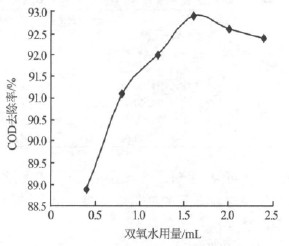 通過實驗考察了雙氧水用量對COD 去除率的影響,結果見圖2。由圖2 可見,隨著雙氧水用量的增加,COD 去除率逐漸增加,雙氧水>1.6 mL 時,COD去除率反而下降,實驗中確定雙氧水用量為1.6 mL。