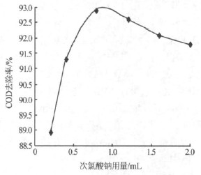 實驗考察了次氯酸鈉用量對COD 去除率的影響,見圖3。由圖3可見, COD 去除率隨著次氯酸鈉用量的增加而增加,但當次氯酸鈉>0.8 mL 以后,COD 去除率反而下降,實驗確定次氯酸鈉用量為0.8 mL。具體參見http://www.xhxdt.com更多相關技術文檔。