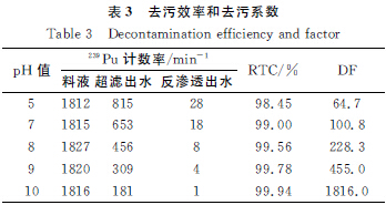 熊忠華等[21]采用超濾+反滲透組合工藝處理了含Pu低放廢水,用超濾取代傳統(tǒng)的絮凝沉淀作前處理單元,不僅降低了二次污染,而且提高了廢水體積減容倍數(shù),滿足了下一級反滲透的進水要求,改善了下游工藝的凈化效果,研究了廢水處理的去污效率和體積減容倍數(shù)的影響因素,實驗結果列于表3。結果表明,當料液pH=10時,該工藝對Pu的去除率達99.94%,廢水體積減容12.5倍。