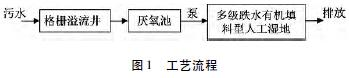 六合張灣村為2012 年江蘇省村莊環境整治三星級村莊。污水收集涉及戶數200 戶,合計共700 人。根據張灣村集中居住點的實際情況,取用水量100 L/(人·d) ,計算得出示范工程覆蓋區域總用水量為70 m3/d。生活污水排放量一般為總用水量的75% ~90%。根據該村的現實情況,污水量取用水量的85%,總污水量為59. 5 m3/d,工程設計處理污水量取60 m3/d。污水主要來源于每戶化糞池出水、洗滌洗浴用水及初期雨水。根據污水量設計厭氧池總容積為40 m3,停留時間為12 h; 人工濕地面積為12. 5 m×4. 5 m = 56. 25 m2,水力負荷達1. 05 m3/m2。該工程于2012 年5月份完工,工程總投資15 萬元。工藝流程如圖1 所示。