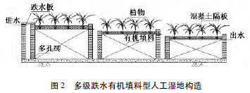 多級跌水有機填料型人工濕地共分4 級,污水由泵從厭氧池提升至布水區,進入第一級跌水充氧導流槽后再導入該級人工濕地,自下而上流入第二級跌水充氧導流槽后導入第二級人工濕地,如此循環往復后最終由集水區排出。人工濕地由混凝土隔板分為上下兩部分,上部由植物栽植層、5 cm厚粒徑0. 005 ~0. 01 m 細石子層和15 cm厚粒徑0. 03~0. 05 m 加氣混凝土砌塊層組成,下部為有機填料層。污水水面控制在加氣混凝土砌塊層上端,栽種植物為美人蕉。構造如圖2 所示。