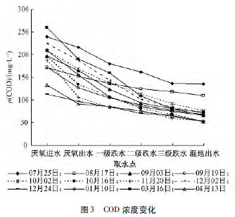 圖3 為COD 濃度變化圖。由圖3 可知: 進水ρ(COD) 波動較大,最高可達260 mg/L,最低為113 mg/L,整體來看,自厭氧池進水至濕地出水,COD濃度呈逐漸降低趨勢,尤其是在二級跌水前,COD 濃度降幅較大,表明污水中COD 的去除主要發生在二級跌水前。分析認為COD 去除主要通過沉淀、過濾、微生物吸附及厭氧好氧生物新陳代謝等去除[2],有機物經厭氧發酵、好氧微生物吸附吸收及分解后至二級跌水處濃度已降低至100 mg/L 左右,經三級跌水后濃度降低逐漸減緩。