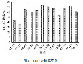 從圖4 可以看出: 濕地開始運轉的前2 次去除效率較低,此時厭氧池及濕地內填料尚未掛膜,植物沒有完全復蘇生長,根系不發達,從而導致去除率較低。隨著季節變化,COD 去除率明顯提高,一般均保持在60%以上,最高可達73. 3%,即使冬季COD 去除率也能維持較高水平(出水ρ(COD) = 61 mg/L) ,表明盡管冬季氣溫較低,微生物活動減弱,但一方面跌水的設計增加了污水中溶解氧濃度,另一方面彈性填料取代石子、黃沙等傳統填料也大大增加了濕地內部微生物數量,因此,在冬季仍表現出較高的COD 去除效率。