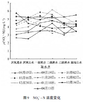 由圖5 的檢測結果看,進水TN 濃度自檢測開始至2012 年12月2 日,TN 濃度明顯偏高,在5 次檢測中4次均在75 mg/L 以上; 2012 年12月2 日后,進水TN 濃度明顯降低,維持在48. 3~58. 2 mg/L,分析認為可能與居民用水量減少有關。出水TN 濃度除2012 年9月19 日—11月20 日4 次維持在30 mg/L 以下外,其余6次全部超過30 mg/L,最高達54. 3 mg/L,出水濃度偏高。分析認為可能由于跌水導致濕地內部溶解氧較為充足,無法形成厭氧環境導致部分NO3--N 無法還原,從2013 年1月10 日的檢測數據中可以看出,NO3--N濃度從濕地進水到出水不降反升。