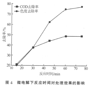 由圖4 可知,隨著反應時間的延長,COD 及色度去除率都在增加,但當反應時間增加到60 min后,COD 及色度的去除率已經趨于穩定。因此,選擇微電解反應時間為60 min。