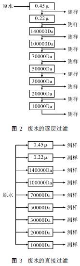 對兩種不同流程的對比可知通過0.22μm 微濾膜和10000Da分子量的膜的COD 量誤差較小,而介于0.22μm 微濾膜和10000Da分子量的膜之間的膜則差別較大。但對于大于0.22μm和小于10000Da分子量的污染物COD的量兩組實(shí)驗(yàn)結(jié)果基本相同。由此可以確定,糖蜜酒精廢水滲濾液中分子量小于10000Da的COD污染物占總COD污染物的72%左右,說明糖蜜酒精廢水中的污染物分子量比較小,大部分為碳水化合物。