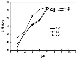 2.4 初始pH 值對Cu2+、Pb2+、Zn2+去除效果的影響