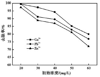 圖5 初始濃度對Cu2+、Pb2+、Zn2+去除效果的影響