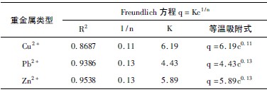 (2) 改性海泡石對Cu2+、Pb2+、Zn2+的吸附特征通過Freundlich等溫吸附式進行擬合,且0.1<1 /n<0.5,證明改性海泡石對此三種重金屬離子表現為易于吸附。