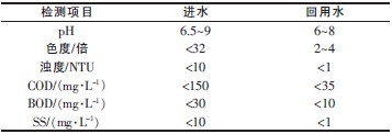 根據(jù)公司提出的洗水工序回用水質(zhì)要求,深度處理系統(tǒng)的進水水質(zhì)標準為現(xiàn)有的印染工業(yè)污水處理廠二級生化二沉池中的水,水經(jīng)深度處理后,必須達到公司的洗水工藝所要求的回用水水質(zhì)標準,其主要水質(zhì)指標如表1。廢水pH、色度、COD、BOD、SS按文獻方法測定。工程化裝置的處理水量為5 t/h,廢水處理系統(tǒng)按24 h 連續(xù)運行,進水溫度<40 ℃。