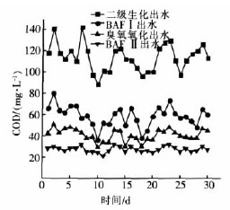 (1)BAFⅠ。原廠經(jīng)二級生化處理后的污水水質(zhì)波動較大,COD 的變動范圍為100~150 mg/L,有時甚至達到170 mg/L。為了保證后續(xù)處理的穩(wěn)定性,先用曝氣生物濾池對廢水進行處理,使廢水COD 降至較低水平,從而減少后續(xù)處理的臭氧投加量,節(jié)約了生產(chǎn)臭氧的電耗,降低成本。BAFⅠ的有效池容積為15 m3,停留時間3 h,采用上流式,氣水比為5∶1,填料選用粒徑為3~5 mm 的球形陶粒。