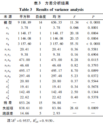 使用方差分析(ANOVA)來檢查二次多項式模型對實驗結果進行模擬的充分性和顯著性,方差分析結果見表3。