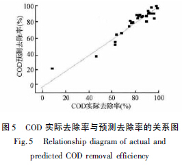 圖5 為廢水COD 去除率的實測值與預測值關系圖。由圖可見,實驗數據點基本分布在直線上,深度處理后煉油廢水COD 去除率的實際值和預測值的皮爾遜相關系數(pearson correlation coefficient)為0.981,說明模型預測值與實測值之間存在良好的線性關系,模型具有較高的準確度。