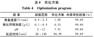 優化目的是尋找最佳反應條件使得響應值最大化,即尋找處理效果最好的工藝條件。根據響應面二次多項式回歸方程,使用Design Expert軟件,求解COD 去除率的最大值,得到優化條件見表4。