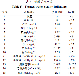 采用優化方案,對煉油廢水進行深度處理,進行了5 組平行實驗,各個指標取平均值,并將實驗結果與《安慶石化回用于循環冷卻水補水的水質標準》進行了對比,實驗結果見表5。
