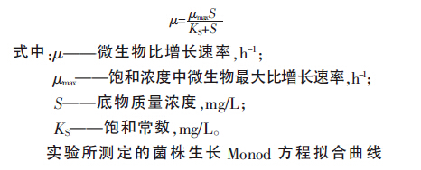 擬合所得Monod 方程動力學參數:μmax=0.438 h-1, KS=27.206 mg/L。所得Monod 方程為μ= 0.438 S/(27.206+S) 。