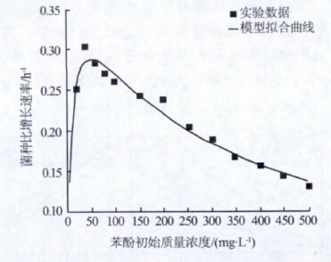 由圖 5 可知,實驗數據與模型預測吻合良好。當苯酚初始質量濃度<50 mg/L 時,菌種的比增長速率隨著苯酚濃度的增加而增大,當苯酚初始質量濃度>50 mg/L 時,菌種的比增長速率有所下降,此時,苯酚對菌種的生長產生了抑制作用。