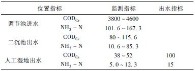 (5) 深度處理采用三級人工濕地系統(tǒng),可確保廢水處理后各項指標穩(wěn)定達到排放標準。運行結(jié)果表明,人工濕地CODCr的去除率達50% 以上,NH3-N 去除率達50% 以上,具有運行費用低、易維護、出水效果穩(wěn)定且耐沖擊等優(yōu)點。