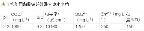 實驗所用廢水是唐山某化纖廠黏膠短纖維生產廢水,其中酸性含SO42-的廢水用吹脫+碳酸鋇化學沉淀法處理去除廢水中的CS2、H2S 并回收SO42-后與其他廢水混合,其水質如表 1所示。