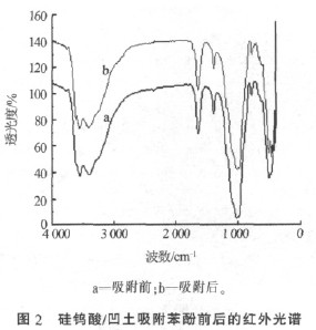 圖2 為硅鎢酸/凹土吸附苯酚前后的紅外譜圖。可以看出,硅鎢酸/凹土吸附苯酚后在紅外譜圖上并沒有明顯的變化,說明硅鎢酸/凹土吸附苯酚是一個物理吸附過程。相比較原凹凸棒土,硅鎢酸/凹土的吸附性能有一定提高,可能是因為凹凸棒土經(jīng)硅鎢酸改性后,微晶有效的比表面積增大,因此可以使其對苯酚的吸附性能增強(qiáng)〔17-18〕。