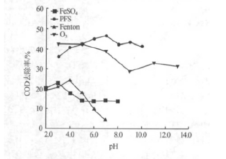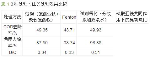 據文獻報道,化學絮凝法、Fenton 試劑法和臭氧氧化法對色度、COD 的去除均有很好的效果,并且可明顯提高廢水可生化性,已被廣泛應用。